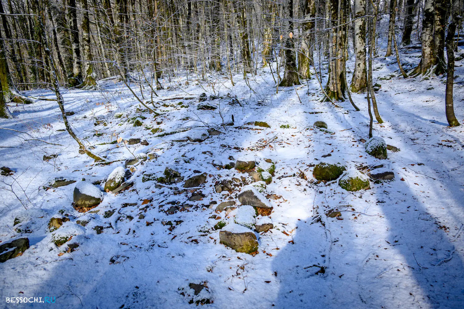 Дальше идти уже попроще, подъем закончился и нам предстоит просто прогуляться по зимнему запорошенному снежком лесу. По мне так даже лучше, земля промерзшая, твердая. Идти довольно комфортно, в отличии от осенней скользкой грязи. По пути встречаем каменные нагромождения — это древние захоронения — курганы.