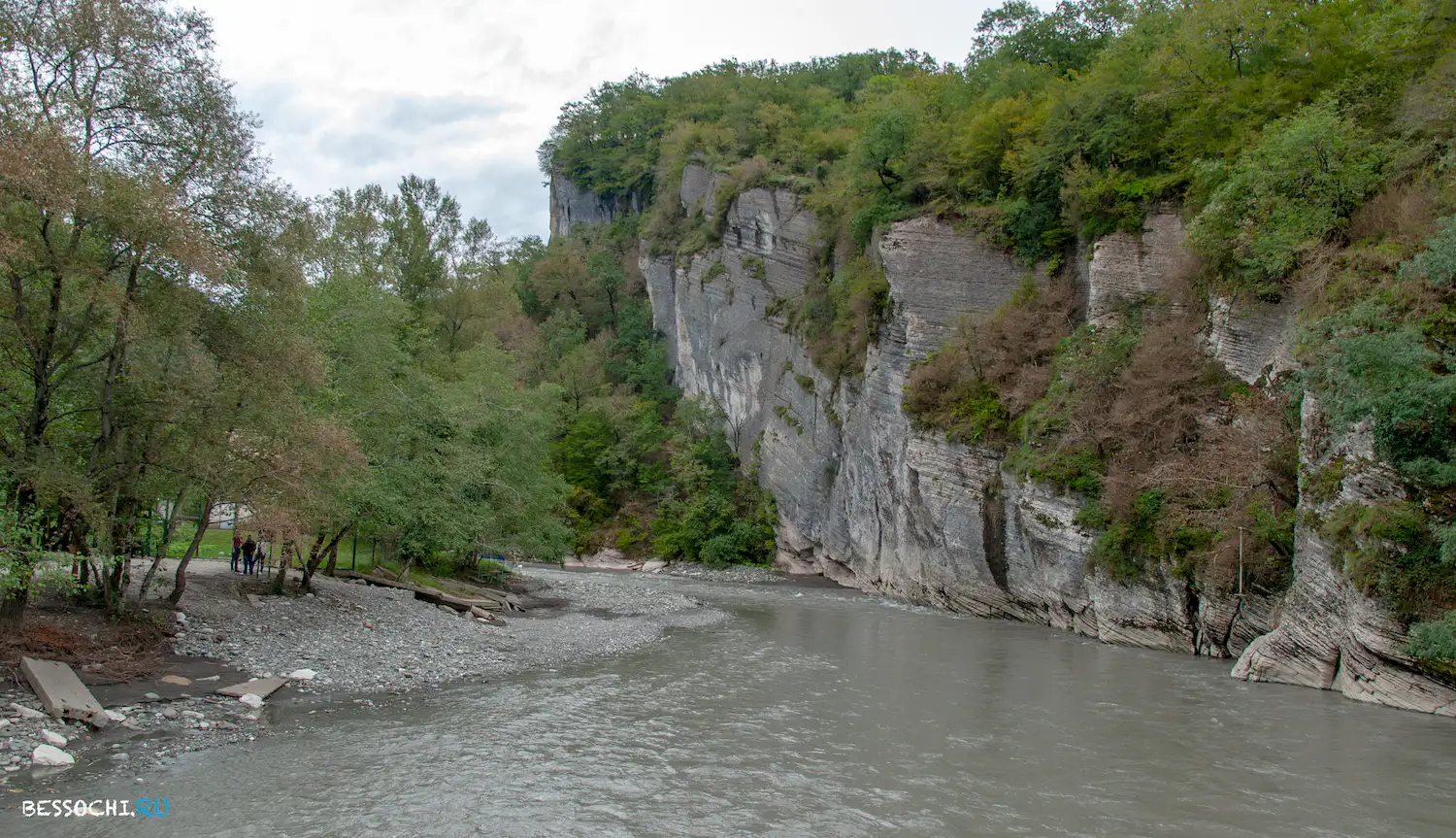 Осмотрев пещеру можно спуститься по лесной тропинке к Форелевому хозяйству. Здесь мы полюбуемся замечательными видами на реку Мзымта и Ахштырское ущелье. А обратно уедем уже на 105 автобусе.